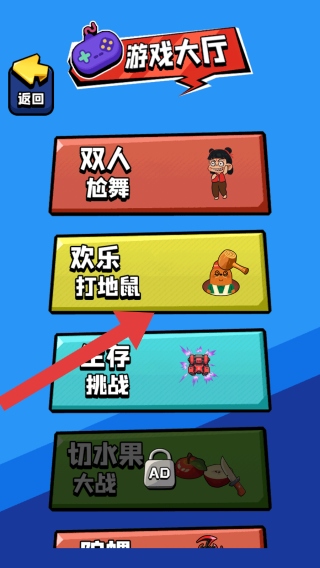 1、进入到游戏大厅,显示了:双人尬舞、欢乐打地鼠、生存挑战等玩法模式,玩家可根据自身喜好进行选择。