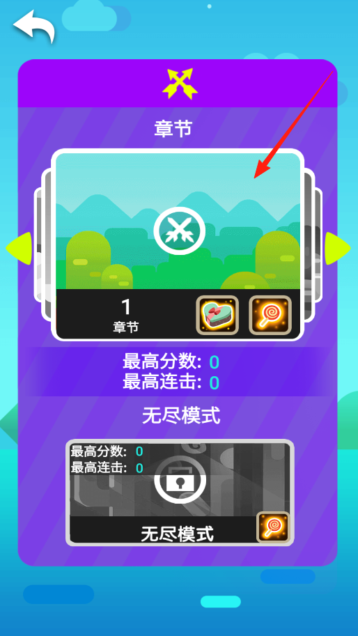 1、进入游戏选关界面,能看到章节和无尽模式,想玩章节关卡,点章节区域里的1章节进入第一关,开始闯关拿分数、刷连击。