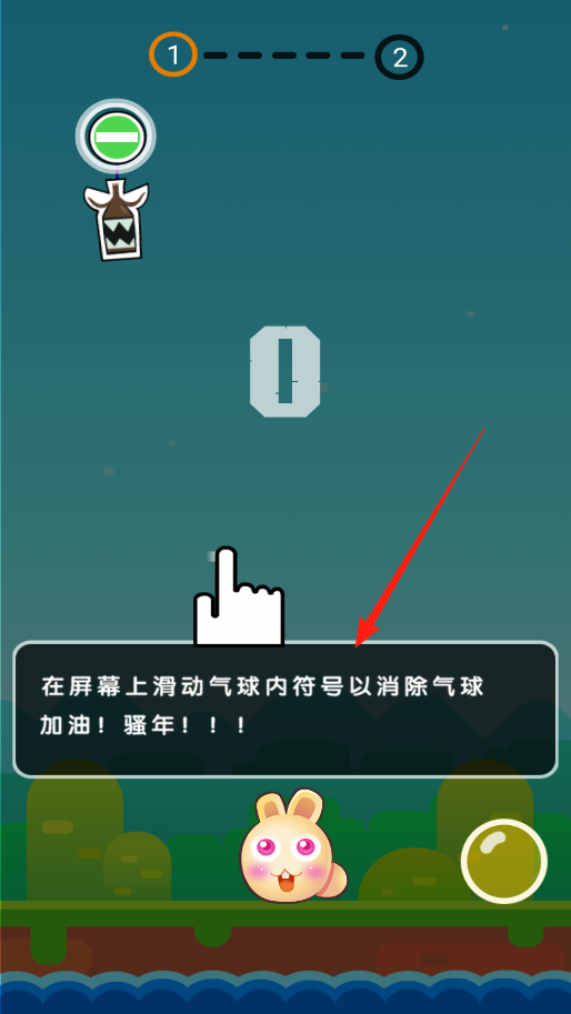 2、第一关开局,有提示教操作,按照在屏幕上滑动气球内符号以消除气球,用手指滑动对应符号,把气球消掉保护下方小兔子,别让气球砸到它。