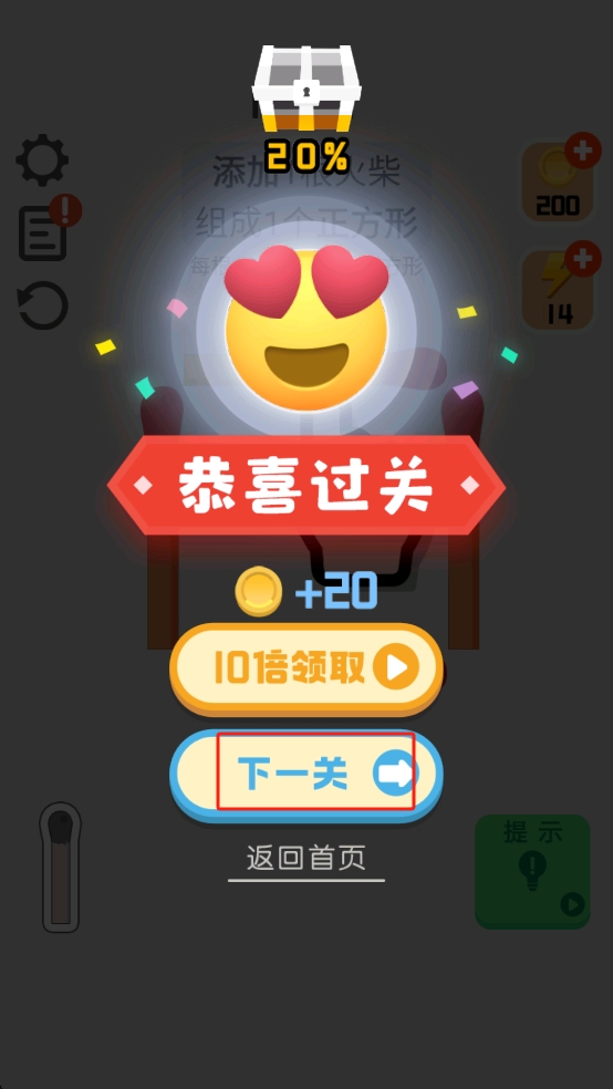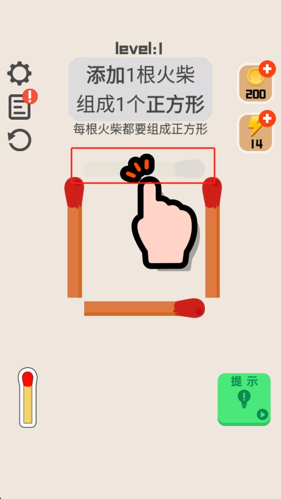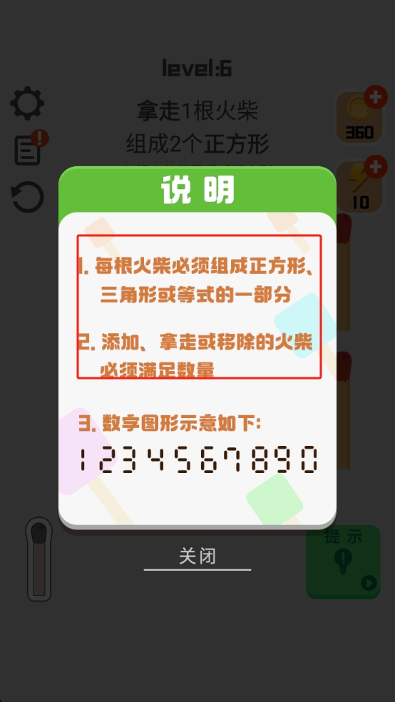 1、即时纠错提示:移动错误时,火柴会闪烁红光并轻微震动,同时弹出再想想的温和提示,不直接给答案,既保留挑战感又避免卡关太久。