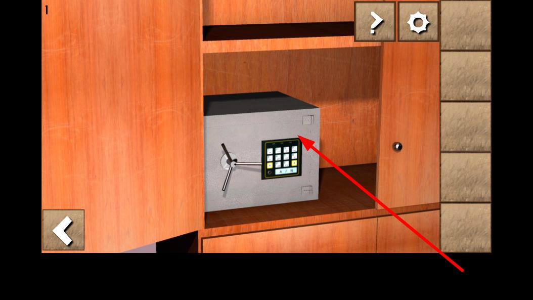 3、在房间场景,找到带密码键盘的保险箱,按箭头指向,尝试输入密码,打开保险箱推进解谜。
