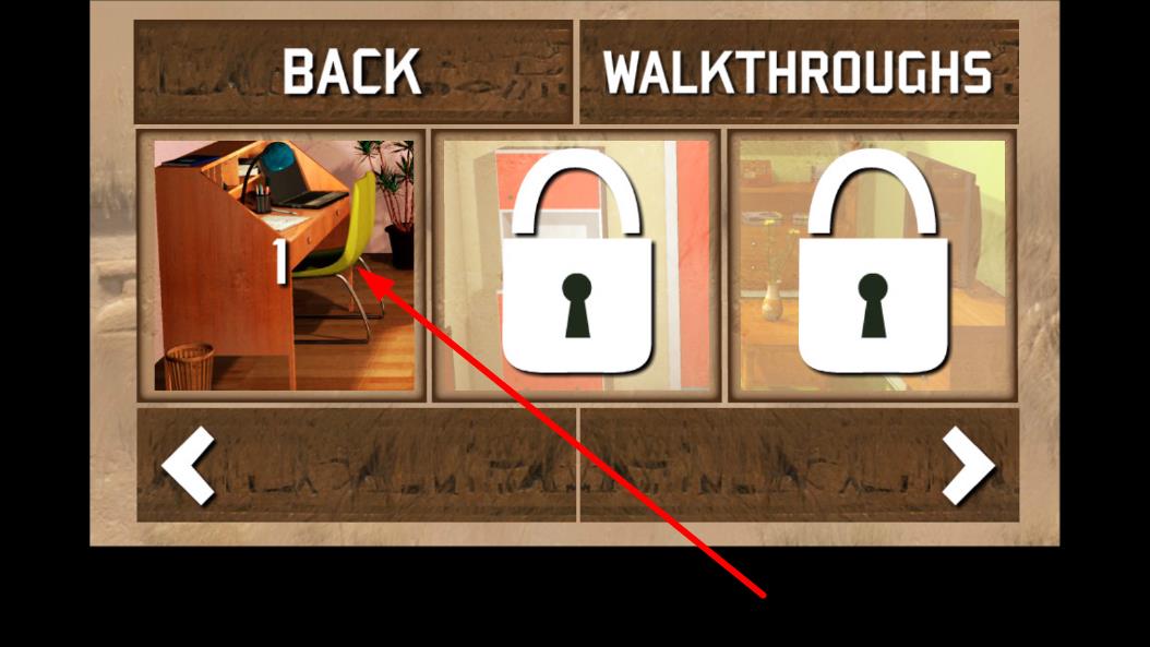 2、进入关卡选择界面,按箭头指引,选择标有1的房间关卡,书桌场景,开始第一关的挑战。
