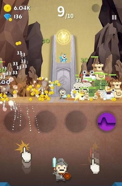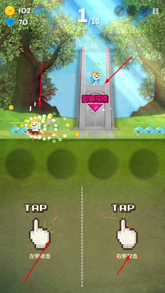 2、点击下方左侧TAP操控左侧角色攻击,点击右侧TAP操控右侧攻击,击退逼近的怪物,保护后方防御塔楼,留意上方波数如1/10,应对多波敌人进攻。
