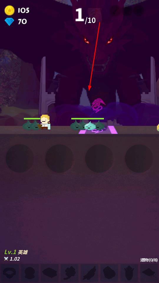 3、战斗中可积累金币、钻石,提升英雄等级如Lv.1英雄,收集遗物如遗物0/8增强战力,完成关卡波数目标,查看游戏进程。