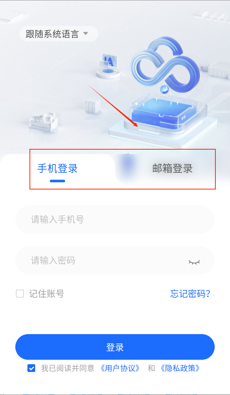 1、打开APP进入登录页,顶部可切换系统语言,选择手机或邮箱登录方式呀。输入对应账号密码,点击眼睛图标可查看密码哦。