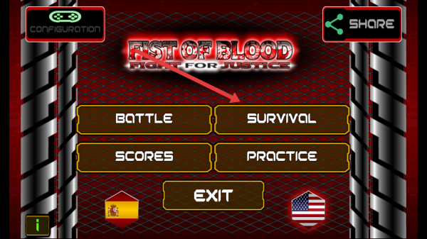 1、在FIST-OF-BLOOD游戏主界面,点击SURVIVAL模式按钮,进入生存模式的挑战流程。