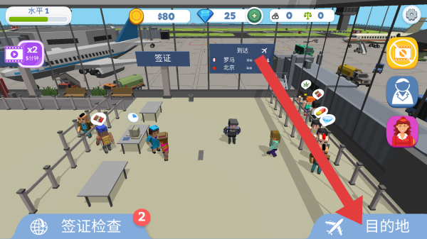 1、需要引导着乘客,可以点击排队乘客,拖至签证着检查台,完成信息的核验,推进了机场的流程。