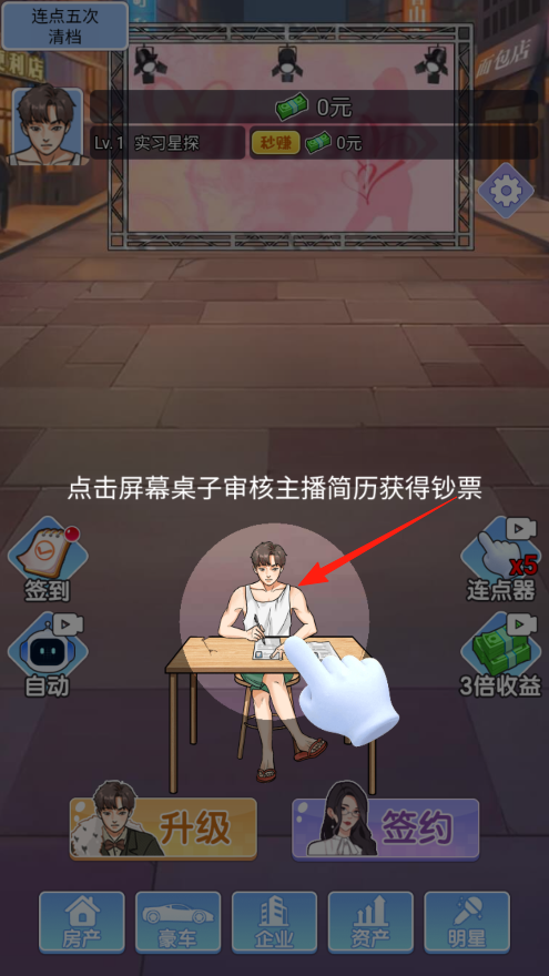 1、你是实习星探要审核主播简历挣钱,看到桌子前的角色,点击他审核简历,每次点能拿到钞票,攒钱解锁更多功能,让自己升级赚钱更快。