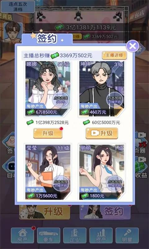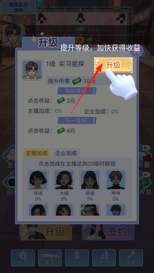 2、想提升赚钱速度,就点升级按钮,花10元升级后,等级变高,点击收益从2元涨到6元,后续还能解锁主播加成,让赚钱越来越轻松。