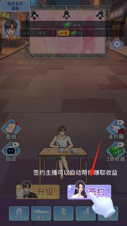 3、光自己点太累的话点签约按钮,招个主播帮你自动赚钱,签约后不用一直手动点,主播会持续带来收益,慢慢攒钱去搞房产豪车这些资产。