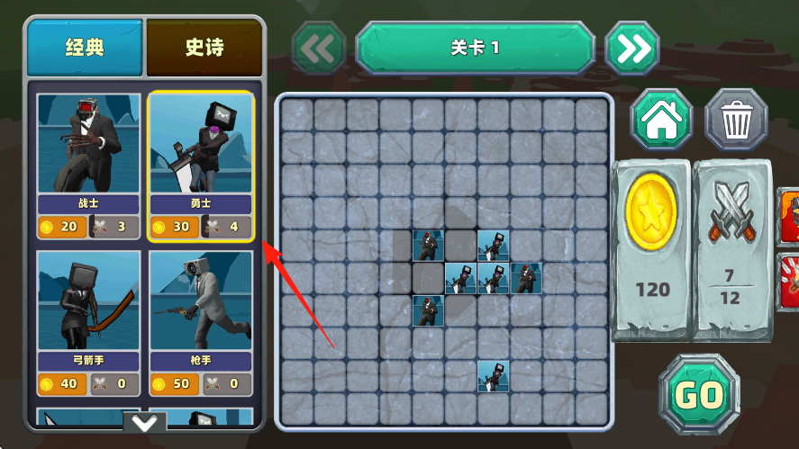 1、关卡1,选史诗模式,左侧点勇士30金币,拖入棋盘红箭头,搭配战士等,凑金币,排兵布阵,点击GO,开始对战。