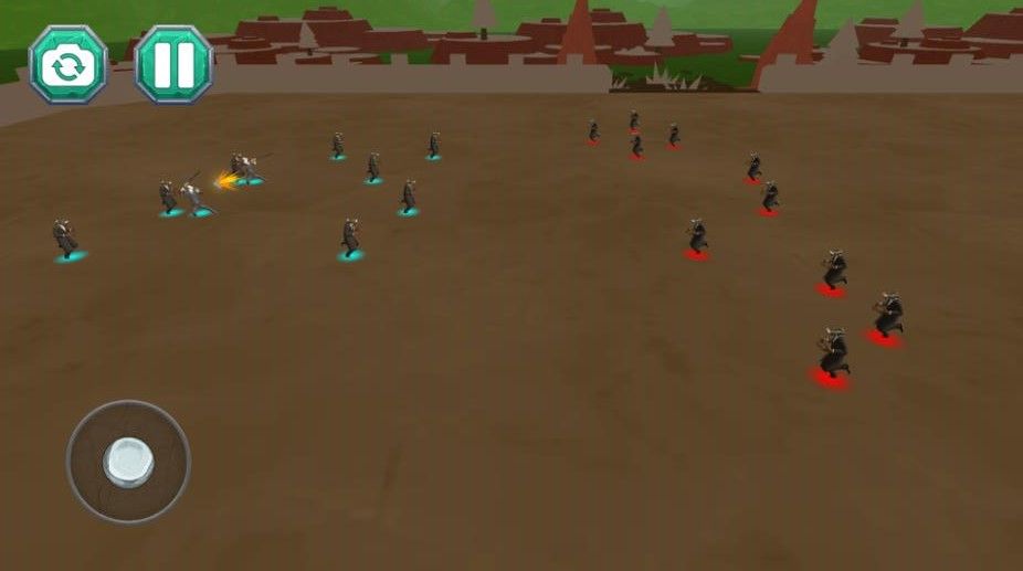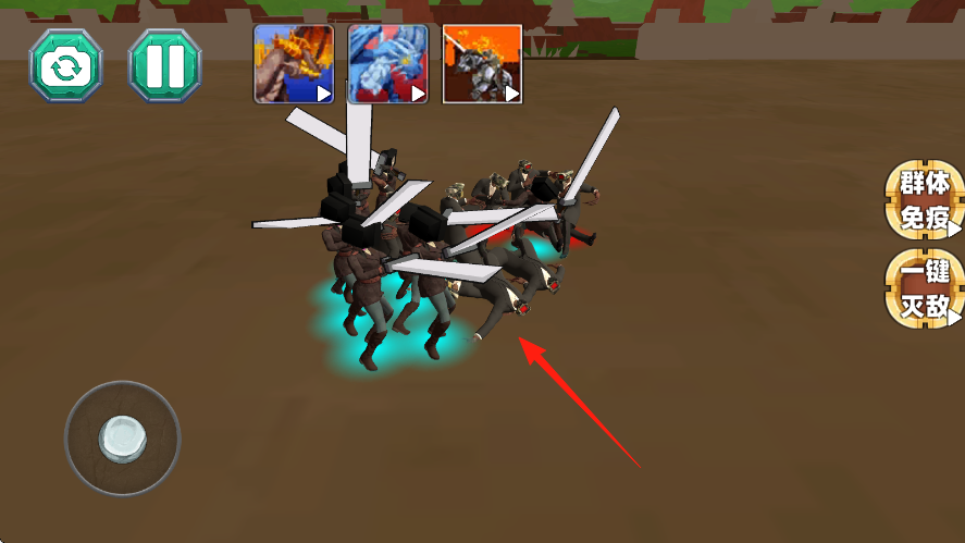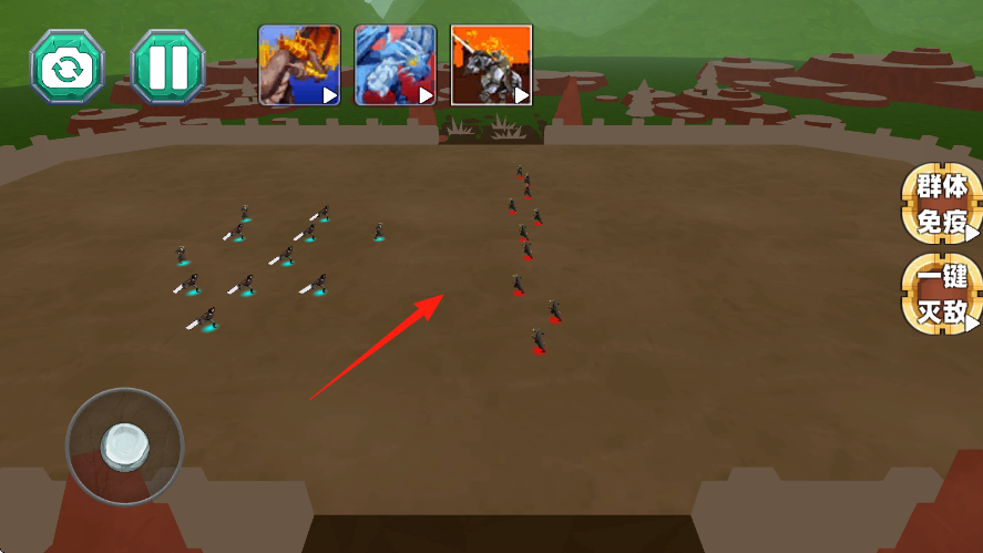 2、战斗中,左右两军在战场对峙,红箭头指敌方,左侧摇杆控兵线,右侧群体免疫、一键灭敌应急,注意上方龙技能可释放清场。