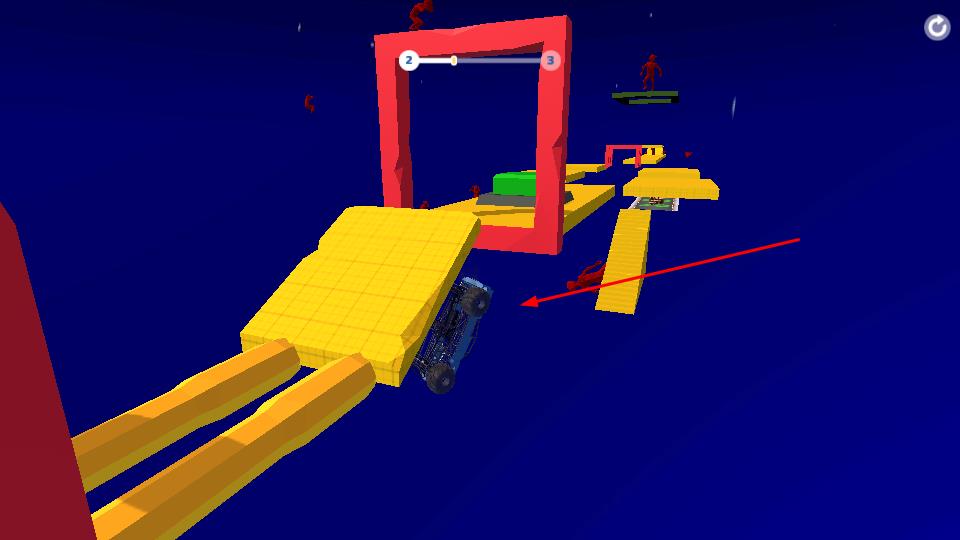 2、驾驶越野车在黄色赛道行进,穿越红色框架类障碍,灵活控车规避翻车,稳步推进至终点。