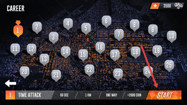 2、赛事选择页选定第1关TIME-ATTACK模式限时60秒、赛程1公里,点击START,开启计时竞速赛。