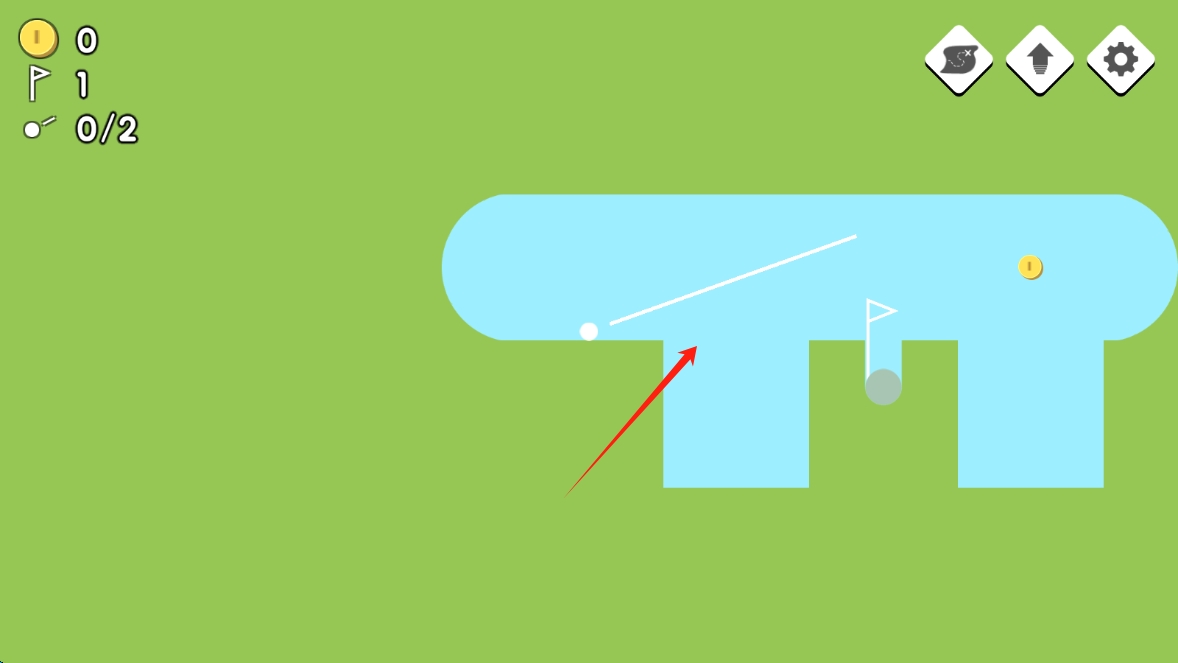 1、在游戏操作界面,留意金币、球杆和击球次数等信息。通过滑动屏幕,精准控制白色小球的击球方向和力度。