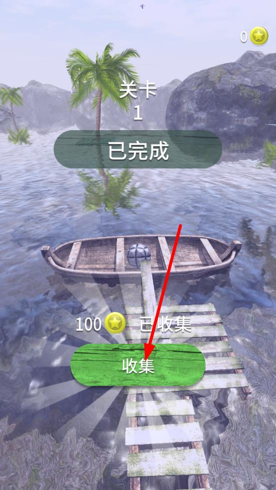 3、操控球体成功抵达终点小船,触发已完成提示,点击收集按钮获取金币与星星奖励,解锁更复杂关卡及金属、水晶材质的球体皮肤。