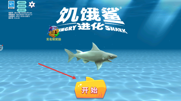 1、点击开始进入游戏,操控鲨鱼在海洋场景觅食,优先吞小鱼、金币,快速积累分数、升级。