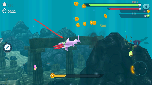2、遇石桥、礁石区,灵活转向避碰撞,解锁特殊鲨鱼,利用技能猎更大猎物,像长条形红鱼。