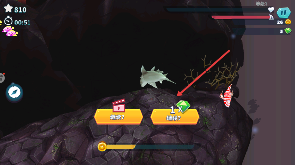 3、鲨鱼搁浅或受伤时,选继续按钮复活,延续游戏,攒钻石开新鲨鱼、皮肤,探索更深海域,挑战Boss。