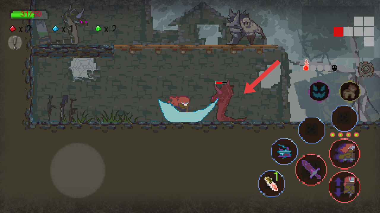 1、遭遇红色怪物时,点击右侧技能图标进行攻击,留意左上角自身的血量31/50,适时闪避,避免被连续攻击。