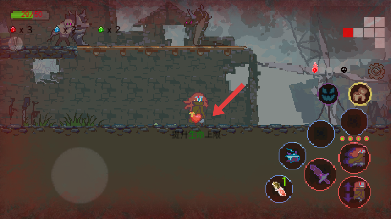 2、需要拾取地面红色心形道具,触发提升生命上限的效果,增强角色生存能力,后续冒险能够更耐打。
