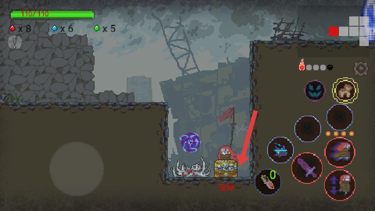 3、靠近场景中的宝箱,先清理周围怪物,再开启宝箱获取奖励,注意右侧技能栏搭配使用,应对突发的敌人。
