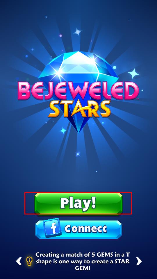 1、点击主界面醒目的绿色Play!按钮,进入宝石消除关卡,此时界面顶部同步显示关卡进度、目标分数等核心信息,正式开启宝石消除的挑战流程。