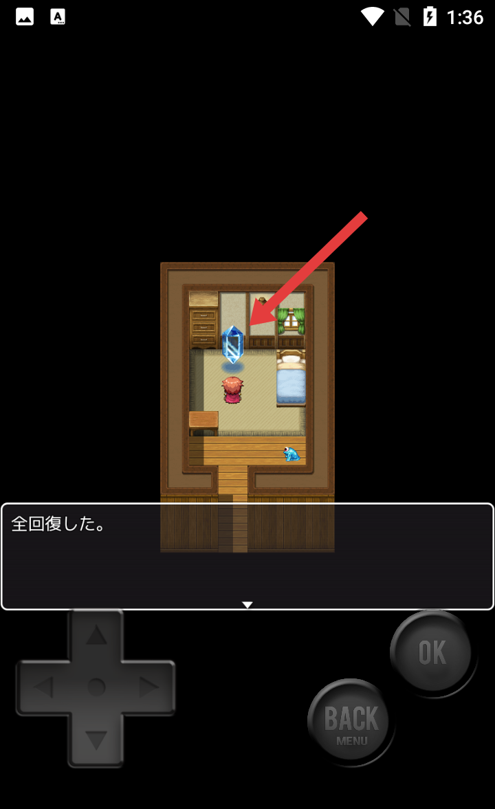 3、靠近房间内悬浮的蓝色水晶,触发恢复效果,屏幕底部显示全回復した提示,恢复角色生命值等状态。