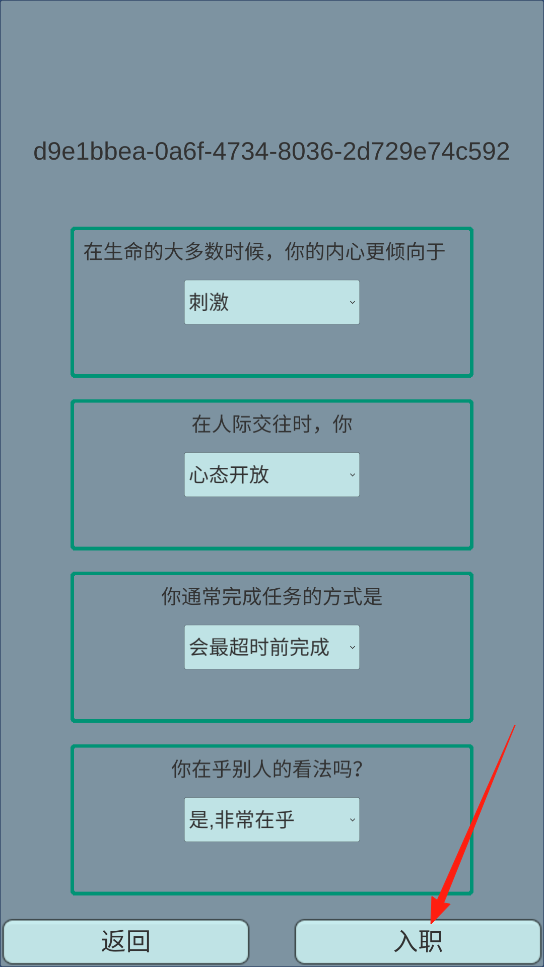 2、先填好这些关于自己性格做事风格的问卷,每个问题选符合自己的答案,填完后点入职,这样就能正式加入游戏里的职业体系,开启新身份的冒险啦。