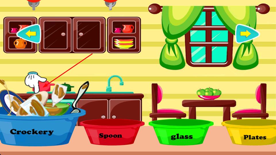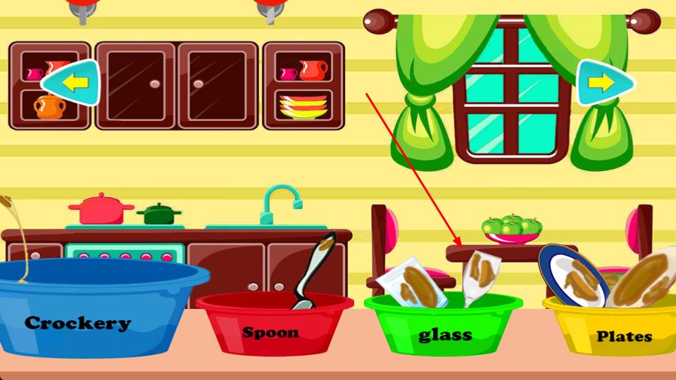 1、进入厨房场景,将台面上的餐具按类型分拣,分别放入标有Crockery、Spoon、glass、Plates的对应盆中,完成分类整理。
