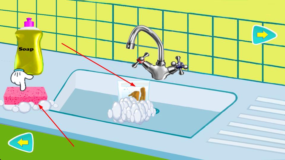 2、选取待清洗的餐具,移至水槽区域,借助标有Soap的洗洁精、粉色海绵,配合水龙头流水完成清洁操作。