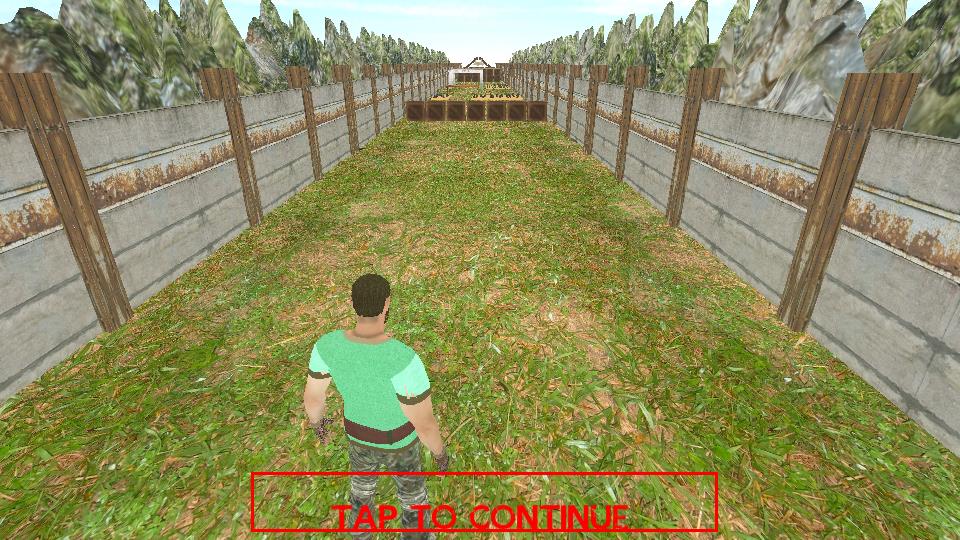 1、点击界面TAP TO CONTINUE提示区域,操控身着绿色上衣的角色进入围栏围合的场景,正式开启生存挑战流程。
