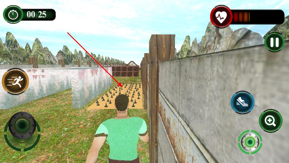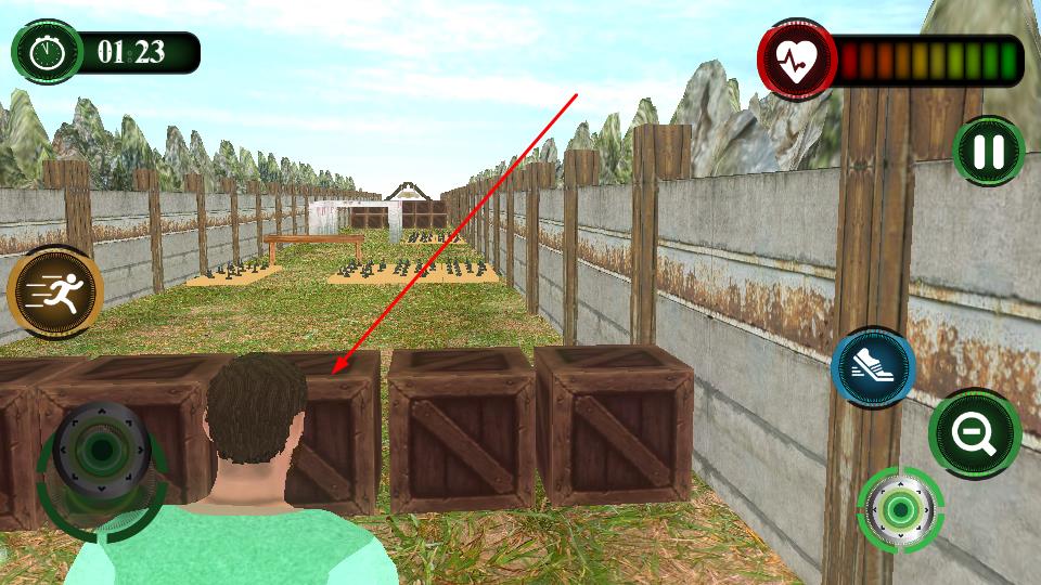2、通过左侧虚拟摇杆操控角色移动,利用前方木箱等掩体遮挡潜在威胁,同时密切留意界面顶部的时间倒计时与血量条状态,确保角色存活时长。