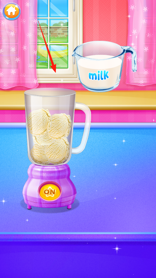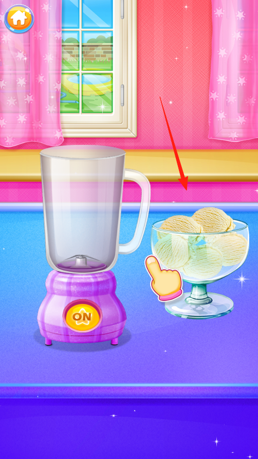 1、准备做美味奶昔啦,先看界面里的冰淇淋和搅拌机,把冰淇淋碗拖到搅拌机里,这是第一步,把食材放进去,后面才能开始制作。