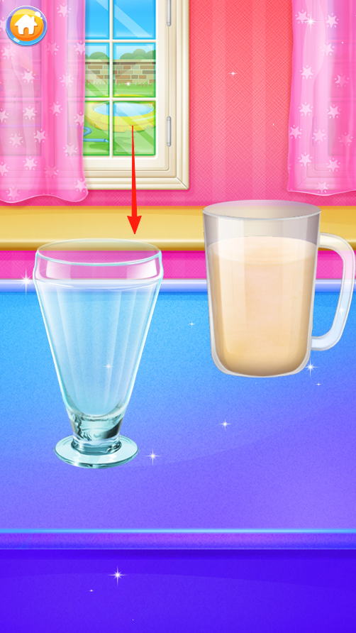 3、奶昔做好后,界面出现两个杯子,一个空的一个装着奶昔,把空杯子拖到指定位置,就能把做好的奶昔倒进去,完成最后一步,享受自己做的美味啦。