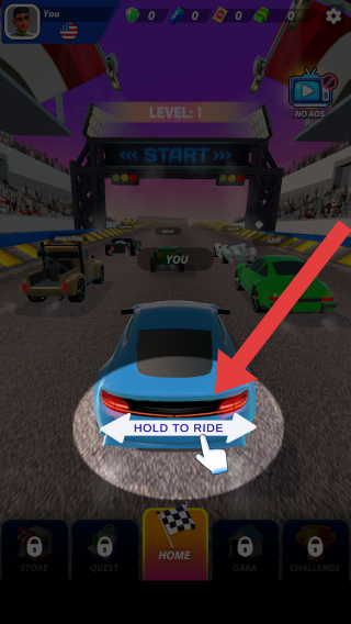 1、目前处于赛前准备的场景,玩家可点击HOLD-TO-RIDE方可进入场景,画面中还有其余不同类型的赛车。