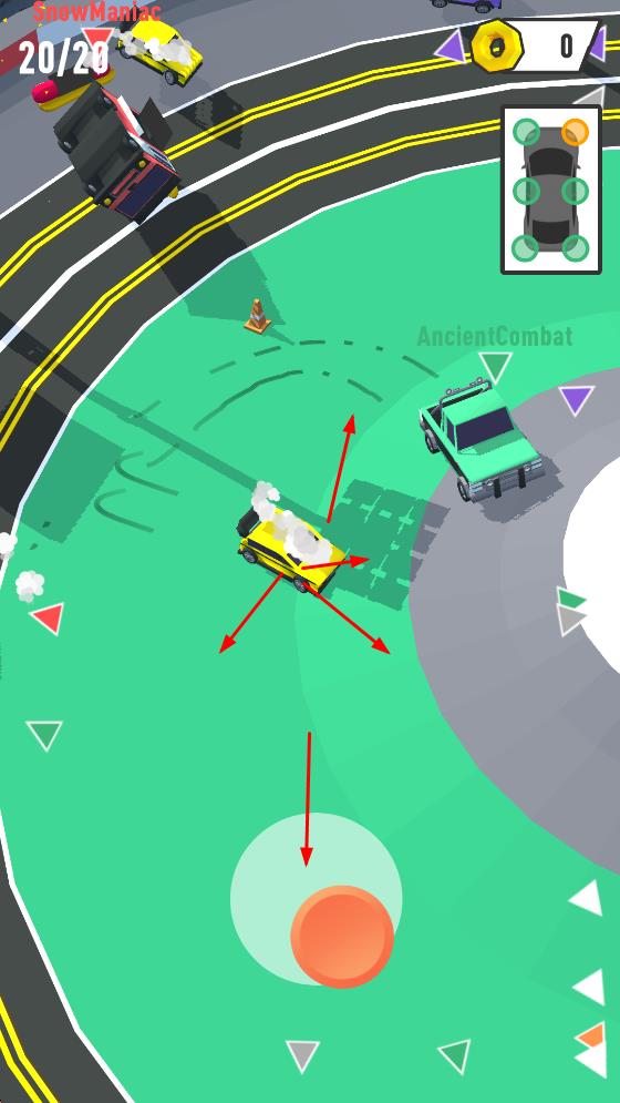 1、操控车辆在赛道移动,利用箭头指引方向,与其他车辆对抗,争取占据优势位置。