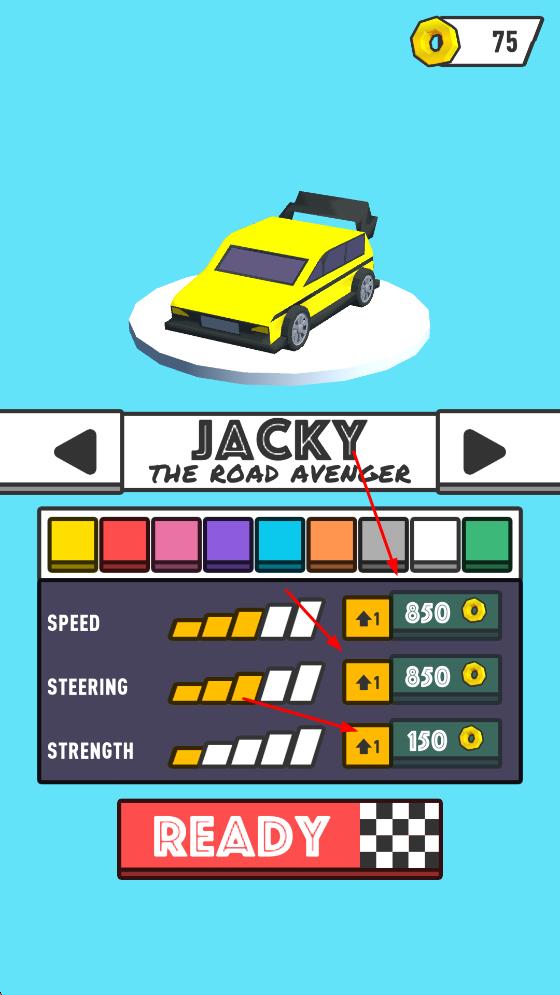 2、选择角色Jacky,花费金币升级速度、转向、力量属性,提升车辆战斗能力。