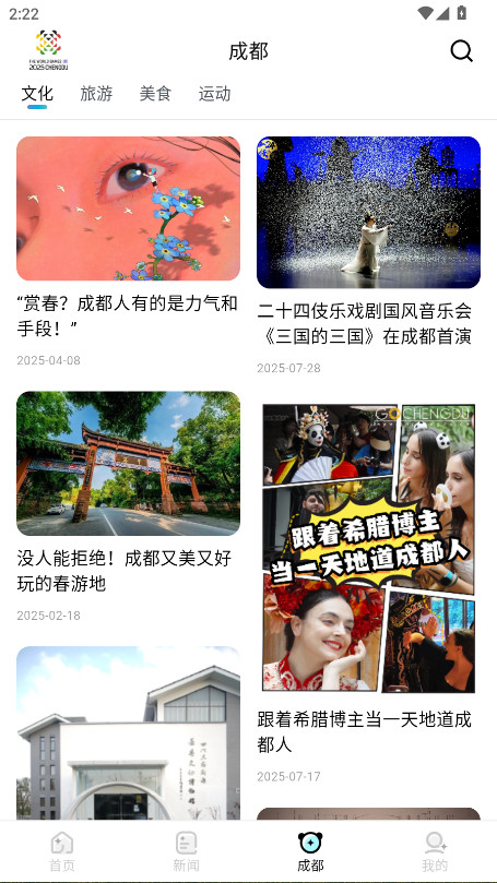 7.点击成都板块,就会有成都文化、旅游、美食、运动类的相关推荐内容。