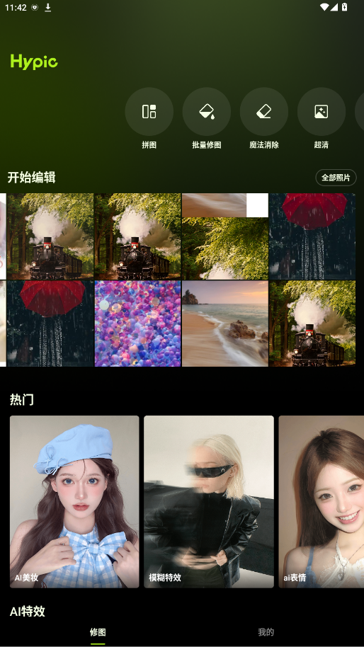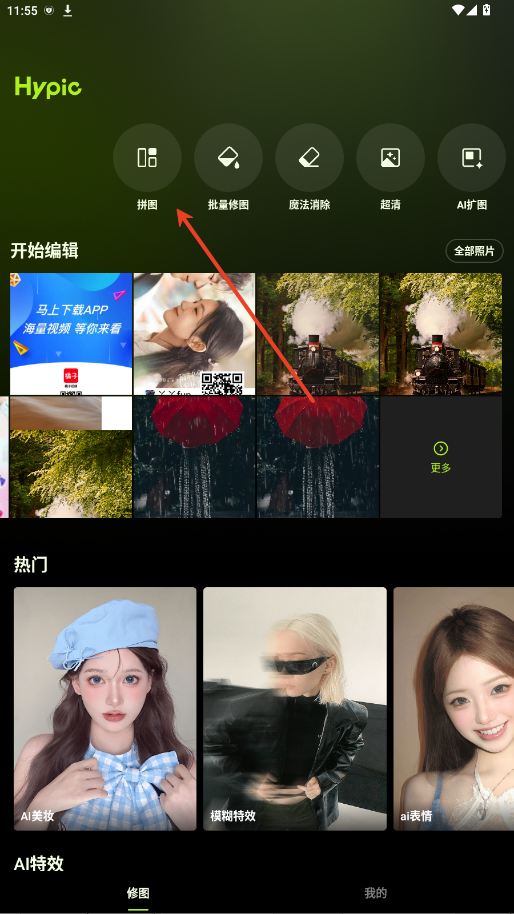 1.下载hypic点击打开,可以看到首页的功能布局,点击中间的【拼图】【批量修图】【我的项目】【消除笔】或是点击【+导入】进入修图页面