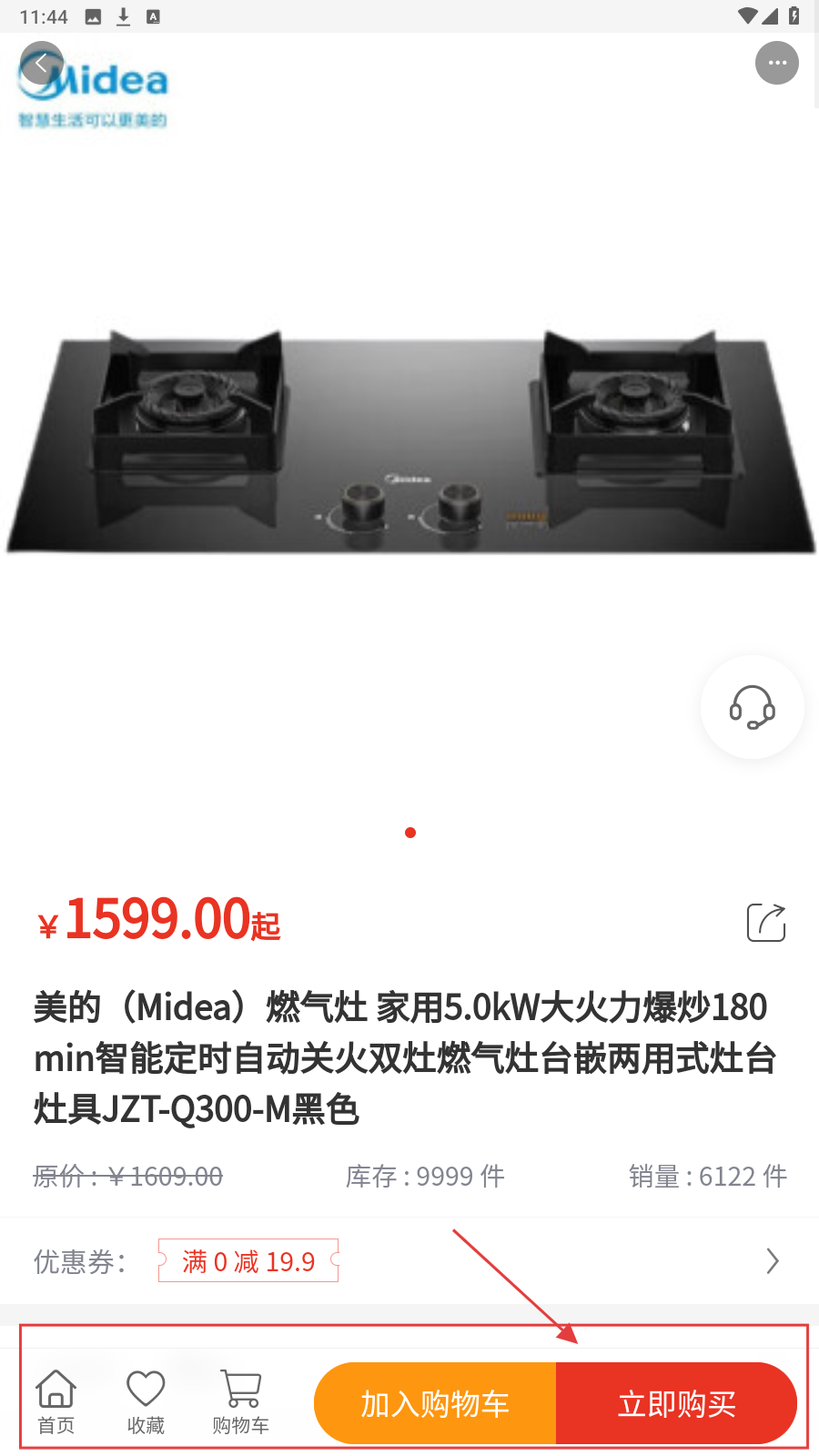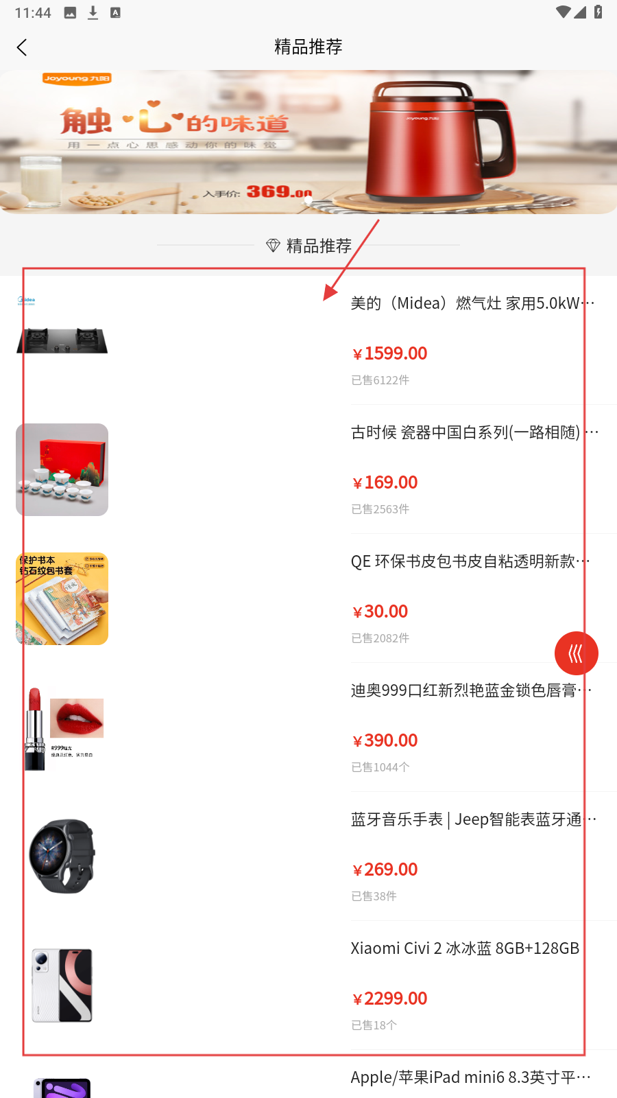 2、在精品列表,选目标商品(如美的燃气灶)查看详情。