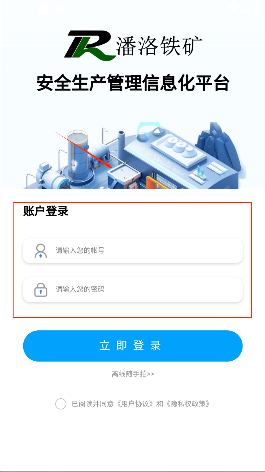 1、打开APP进入登录页,蓝白工业风界面简洁明了,输入框提示"请输入您的帐号"和"请输入您的密码"呀。密码输入时注意大小写哦。