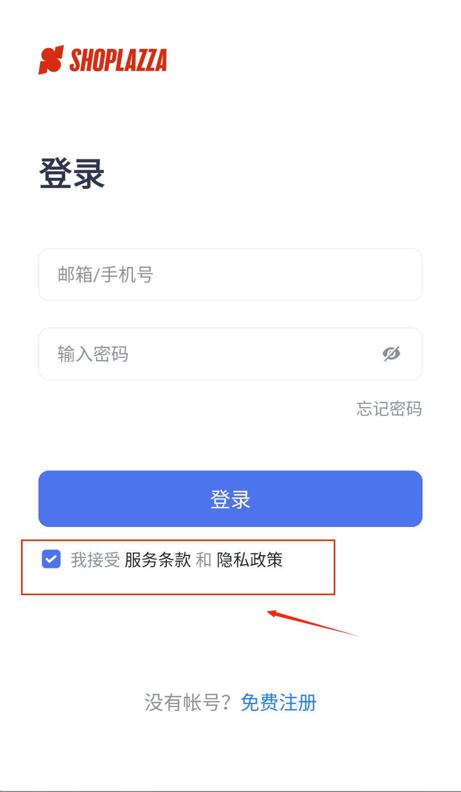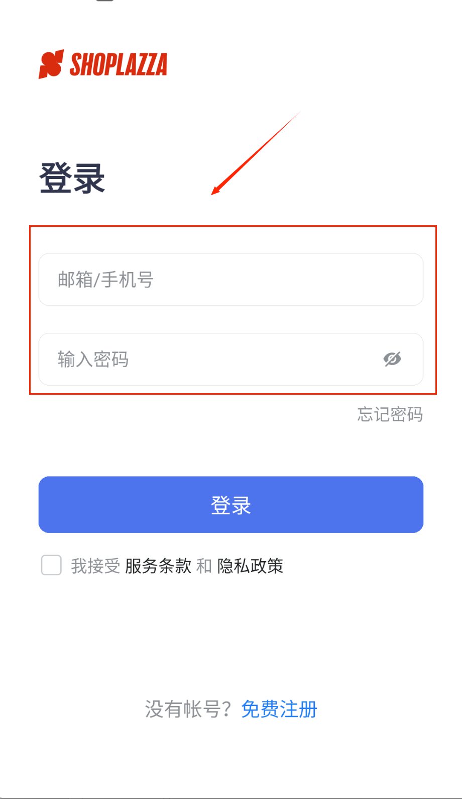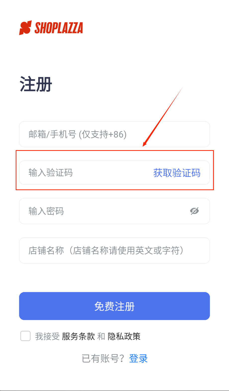 1、打开APP进入注册页,顶部红色SHOPLAZZA标志醒目,输入框提示"邮箱/手机号(仅支持+86)"呀。密码框右侧眼睛图标可切换显示哦。