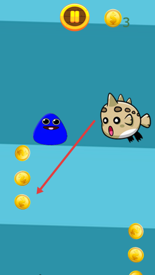 1、点击PLAY开始,操控蓝色果冻状角色在蓝色场景滚动,收集金币,避开尖刺鱼等障碍。