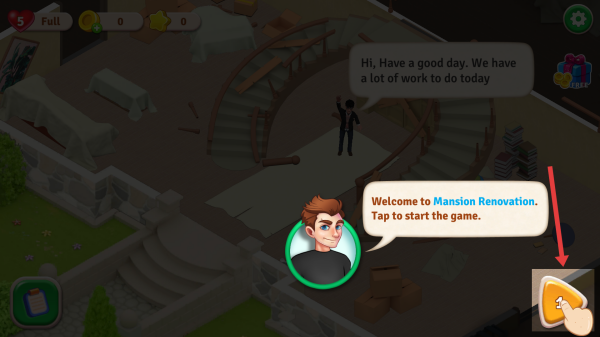 1、在Mansion Renovation游戏中,点击提示的按钮,开始游戏流程,进入豪宅翻新的冒险之旅。