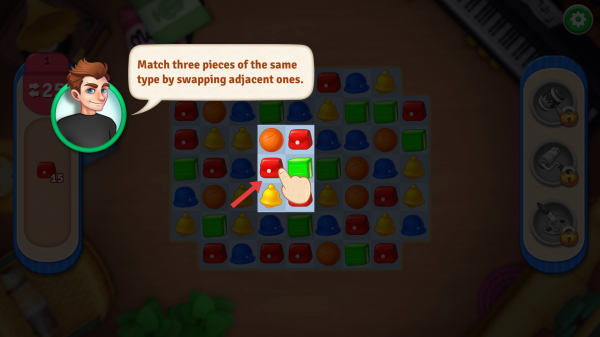2、在游戏过程中,通过交换相邻物品的位置,使三个相同类型的物品连成一线,完成消除,获取分数和翻新所需的资源。