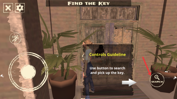 3、在游戏中,当发现可能存在关键物品的区域时,点击SEARCH按钮,让角色对该区域进行搜索,拾取找到的钥匙等关键物品,推进游戏剧情发展。