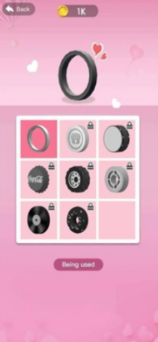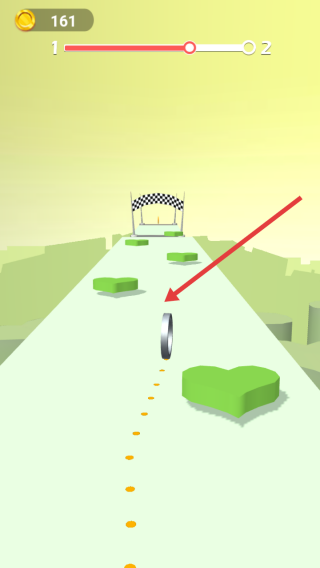 2、在赛道上,通过点击屏幕控制戒指转向,避开爱心障碍,收集金币,向终点推进,提升滚动进度。