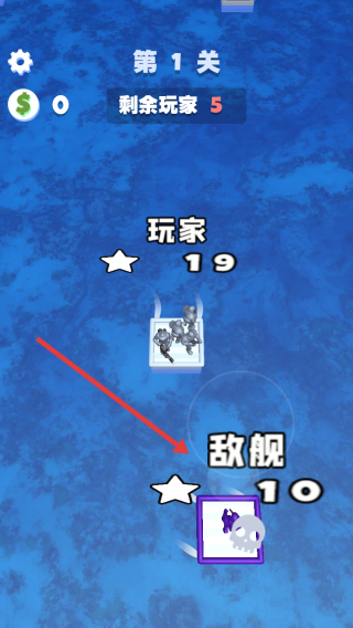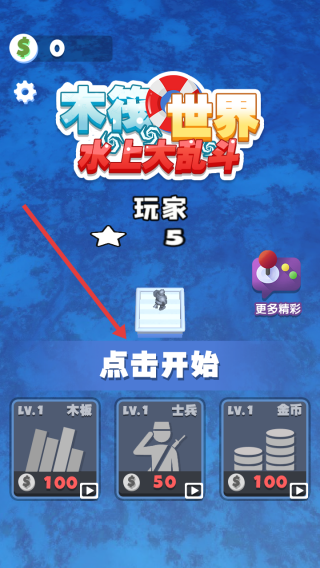 1、点击主界面点击开始,进入游戏的第1关,操控木筏参与对战,初始玩家等级5。