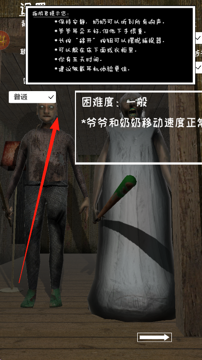 1、开局查看难度提示,牢记保持安静、利用藏身处等规则,按指引应对爷爷奶奶,在五天内完成逃脱。